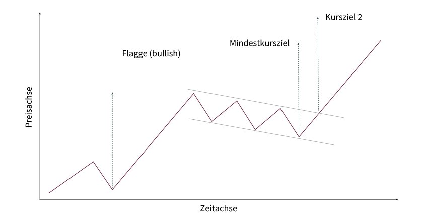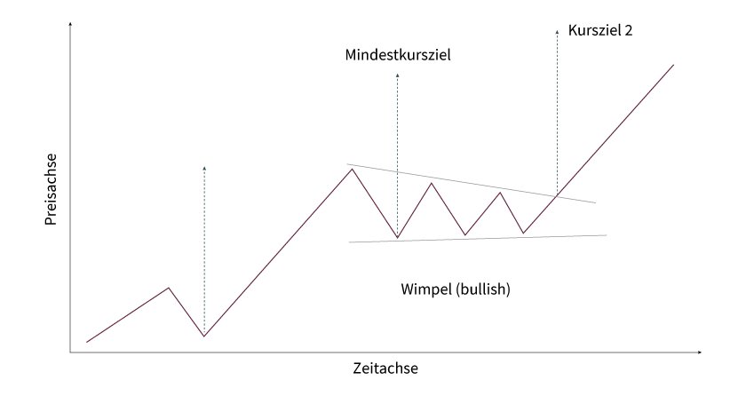Bei der Flagge (siehe Grafik 1) entsteht anschließend ein Parallelogramm oder ein Rechteck mit zwei parallelen Trendlinien, die gegen den vorausgegangenen Trend geneigt sind. Beim Wimpel (siehe Grafik 2) verläuft das Kursgeschehen eher seitwärts und es bildet sich ein symmetrisches Dreieck mit konvergierenden Trendlinien aus. Eine häufige Beobachtung ist, dass Flaggen und Wimpel in einem Abwärtstrend eine geringere Zeit zur Ausformung benötigen als in einem Aufwärtstrend. Beide Muster werden mit dem Ausbruch über die begrenzende Trendlinie abgeschlossen. In einem Aufwärtstrend sollte es entsprechend zu einem dynamischen Anstieg über die obere Begrenzung der Flagge bzw. des Wimpels kommen. Nur relativ selten kommt es im Rahmen von Flaggen und Wimpeln zu Trendwenden statt zu Trendfortsetzungen.