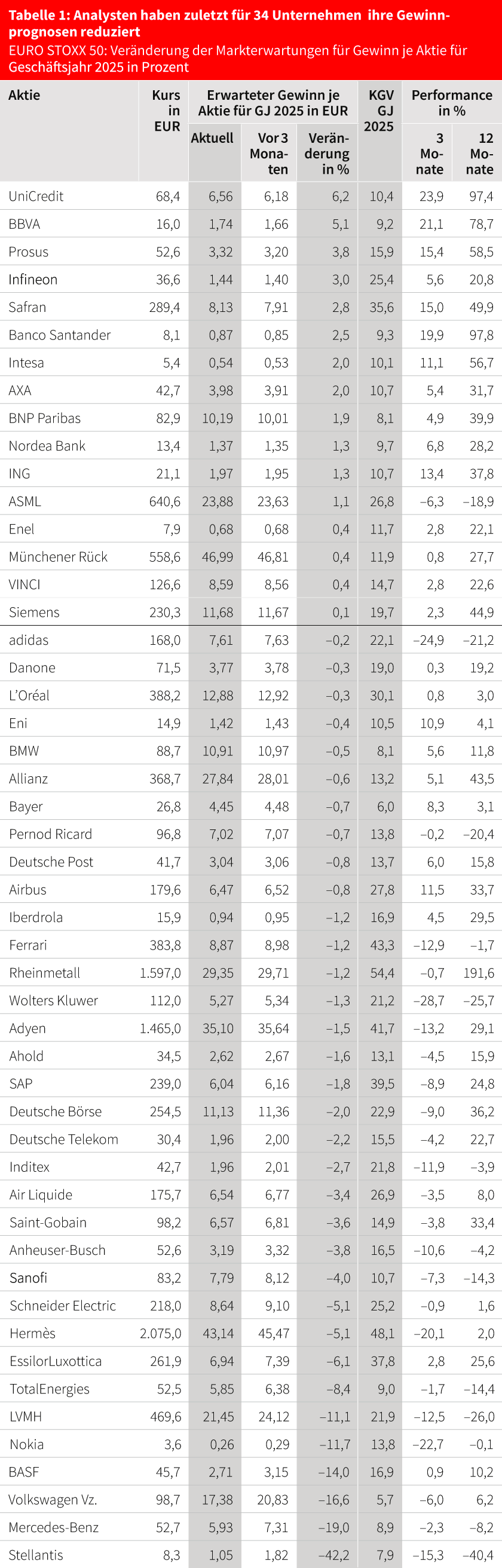 Kurzfristig halten wir es für unwahrscheinlich, dass sich die DAX-Unternehmensgewinne nach oben bewegen werden, da die DAX-Gewinnsaison bislang ein durchwachsenes Bild zeigt. Eine Reihe der Unternehmen musste die Jahresziele zurückschrauben, unter anderem belastet von der jüngsten Stärke des Euro. Das Gewinnrevisionsmomentum am deutschen Aktienmarkt ist daher weiterhin negativ, was auch die derzeitigen Gewinnrevisionen im EURO STOXX 50 zeigen. So haben die Analysten im vergangenen Quartal für 34 der 50 Aktien im EURO STOXX 50 ihre Gewinnprognosen für das Geschäftsjahr 2025 reduziert. Viele DAX-Unternehmen – beispielsweise aus den Sektoren Auto und Chemie – befinden sich unter diesen negativen Gewinnrevisionsaktien (siehe Tabelle 1).