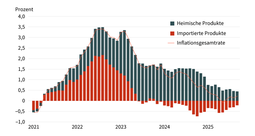 Ein Argument für unveränderte Zinsen dürfte vor allem bei der Inflation zu finden sein. Üblicherweise reagiert die SNB nicht allzu stark auf die Entwicklungen bei der Realwirtschaft. Zum Zeitpunkt der letzten Zinssenkung in den negativen Bereich war das Wachstum schließlich noch deutlich stärker und es gab keine US-Zölle zu fürchten. Für die SNB dürfte es eher darauf ankommen, ob sich die Deflationsgefahren angesichts einer Gesamtrate, die in den vergangenen Monaten um das untere Ende des Zielbandes verharrte, wieder verschärfen. Grundsätzlich sollte sich die Gesamtrate aber in den kommenden Monaten weiter stabilisieren: