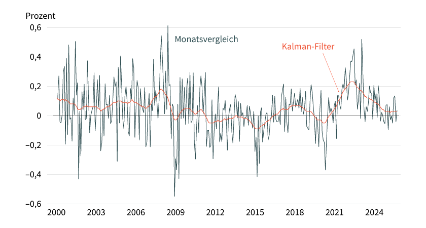 - Die Zinssenkungen dürften so langsam in der Realwirtschaft ankommen. Die an den Leitzins gekoppelten Mieten dürften ohne weitere Zinssenkungen nicht weiter sinken, gleichzeitig ist die Geldpolitik mittlerweile wohl wieder leicht expansiv, was den Lohndruck erhöhen sollte. Zu sehen ist dies auch schön, wenn man die Schweizer Gesamtrate um das Rauschen bereinigt: So zeigt ein Kalman-Filter (sozusagen die Crème de la Crème der Filter), dass sich die Preissteigerungsraten im Monatsvergleich auf einem – wenn auch geringen – Niveau zu stabilisieren scheinen (siehe Grafik 3).
