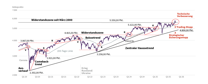 Seit März 2025 lief der Index in eine Konsolidierung hinein (Handelsspanne: Unterstützung bei 5.120 Punkten; Widerstandszone um 5.550 Punkte). Sie hatte einen trendbestätigenden Charakter. Deshalb überrascht es nicht, dass der Index an einem Investmentkaufsignal und am nachhaltigen Sprung über die 25-jährige Widerstandszone arbeitet. Aufgrund der anstehenden Wiederaufnahme der technischen Neubewertung sollte das neue mittel- und langfristige Etappenziel bei 6.000 Punkten liegen.