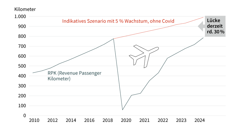 Die Luftfahrtindustrie ist zwar nach der schwierigen Coronapandemie wie der sprichwörtliche Phönix aus der Asche wiederauferstanden. Es bedarf aber noch einiger Jahre mit überdurchschnittlichem Wachstum, bis die entstandene »Pandemielücke« zum historischen Wachstumspfad von 5 Prozent p.a. geschlossen wird.