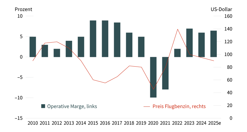 Aufgrund der vielfältigen Einflussfaktoren (volatile Kerosinpreise, kurzfristige Buchungen/Stornierungen, teilweise öffentlichkeitswirksame Streiks etc.) und hohen Investitionen in die Flotte unterliegen die Margen und Gewinne der Airlines meist starken Schwankungen und führen zu vergleichsweise volatilen Aktienkursbewegungen (siehe Grafik 3).