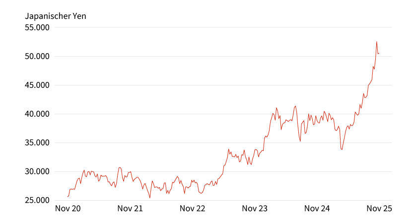 Für Kauflaune sorgte an der Börse in Tokio aber nicht nur die Aussicht auf einen fiskalischen Impuls. Aufhorchen ließ Takaichi zudem durch ein Treffen mit US-Präsident Donald Trump. Beim Gipfel wurde der im Rahmen der im Sommer getroffenen Zollvereinbarung gefasste Plan massiver japanischer Investitionen in den Staaten konkretisiert. Bei den vereinbarten Projekten mit einem Volumen von insgesamt rund 400 Milliarden US-Dollar spielt neben Energieerzeugung und Seltenen Erden der Bereich Künstliche Intelligenz eine wichtige Rolle. Namhafte japanische Unternehmen wie Toshiba, Hitachi oder Mitsubishi Electric sollen helfen, den KI-Boom in den USA voranzutreiben.
