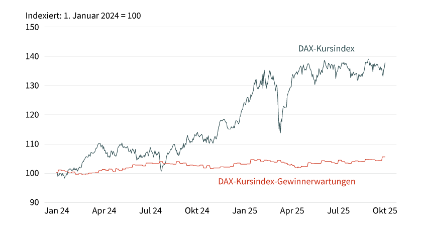 Grafik 1: DAX-Kursindex steigt seit Anfang 2024 um 38 Prozent, während Gewinntrend nur um 5 Prozent zulegt