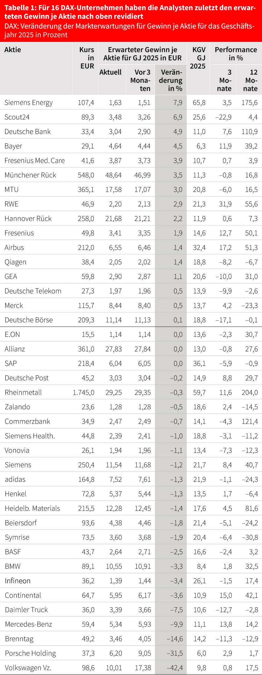 Und zum anderen bremst seit Mai die enttäuschende Entwicklung der DAX-Unternehmensgewinne den DAX. So ist das vom Marktkonsensus für das Geschäftsjahr 2025 prognostizierte Gewinnwachstum für den DAX mittlerweile auf –0,7 Prozent gefallen, nachdem es zu Jahresbeginn noch bei optimistischen 10,7 Prozent lag. Auch das Gewinnrevisionsmomentum der Unternehmensanalysten ist für die DAX-Aktien derzeit immer noch negativ. So haben die Analysten zuletzt nur für 16 der 40 DAX-Unternehmen ihre Prognose für den Gewinn je Aktie im Geschäftsjahr 2025 nach oben angepasst, und 23 DAX-Unternehmen hatten negative Gewinnrevisionen (siehe Tabelle 1).