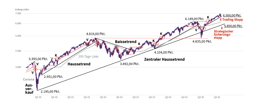 Der S&P 500 befindet sich seit dem Corona-Baissetief bei 2.195 Punkten (März 2020) in einer mehrjährigen übergeordneten Haussebewegung, die allerdings im Jahr 2022 von einer Zwischenbaisse unterbrochen wurde. Diese jetzt seit über fünf Jahren bestehende Hausse wird von der zentralen Haussetrendlinie begrenzt, die im März 2020 startet und über die Kurszwischentiefs bei 3.492 Punkten (Oktober 2022) und 4.104 Punkten (Oktober 2023) läuft und zurzeit bei 5.850 Punkten liegt. Als erster Teil des Risikomanagements sollte bei 5.850 Punkten der strategische Sicherungsstopp, der dann Schritt für Schritt mit dem Anstieg der Haussetrendlinie nachgezogen wird, positioniert werden. In den USA sind im Jahr 2025 der S&P 500 um 16,7 Prozent und der technologielastige Nasdaq 100 um 21,7 Prozent gestiegen. Allerdings muss aus Sicht eines Euro-Investors berücksichtigt werden, dass der US-Dollar (gegenüber dem Euro) in diesem Zeitraum um 11,8 Prozent gefallen ist und damit währungsbereinigt den größeren Teil der Kursgewinne relativiert. Der Index hat nach der Etablierung eines Investment-Kaufsignals (Sprung über die Widerstandszone bei 6.147 Punkten) seit Juli 2025 einen weiteren kurzfristigen Aufwärtstrend (Trendlinie bei 6.600 Punkten) herausgebildet. Hierdurch wurden die technischen Etappenziele für 2025 überschritten und somit eine mittelfristig überkaufte Lage kreiert. Deshalb sollte es nicht überraschen, wenn der Index zum Abbau der überkauften Lage in eine Konsolidierung auf dem derzeitigen Niveau hineinläuft. Als Konsequenz sollte bei 6.600 Punkten zusätzlich ein trading-orientierter Sicherungsstopp liegen. Mit Blick auf 2026 werden die weiteren US-Leitzinssenkungen, ein eventuell schwächerer US-Dollar, die neue US-Steuergesetzgebung und -Zollpolitik, der selektive KI-Boom (»Künstliche Intelligenz«) und die Aktienrückkaufprogramme von erwartet wieder mehr als 1 Billion US-Dollar die Gewinne der S&P 500-Unternehmen auf 300 Punkte pro Index anziehen lassen. Damit weist der S&P 500 ein KGV (Kurs-Gewinn-Verhältnis) für das neue Jahr von sportlichen 22,9 auf. Auch wenn die Mag 7 herausgenommen werden, haben die anderen 493 Indexwerte noch ein KGV von 17 bis 18. Aus technischer Sicht besteht hier der Nachteil, dass Kaufsignale gegen eine hohe Bewertung ankämpfen müssen. Hinzu kommt die Gefahr von Enttäuschungspotenzial beim Reporting speziell im Technologiebereich. Zusammengefasst signalisiert die technische Gesamtlage aber zunächst einen Fortbestand der derzeitigen Hausse mit einem abnehmenden Aufwärtsmomentum für das erste Halbjahr 2026 mit einem Etappenziel von 7.200 bis 7.300 Punkte.