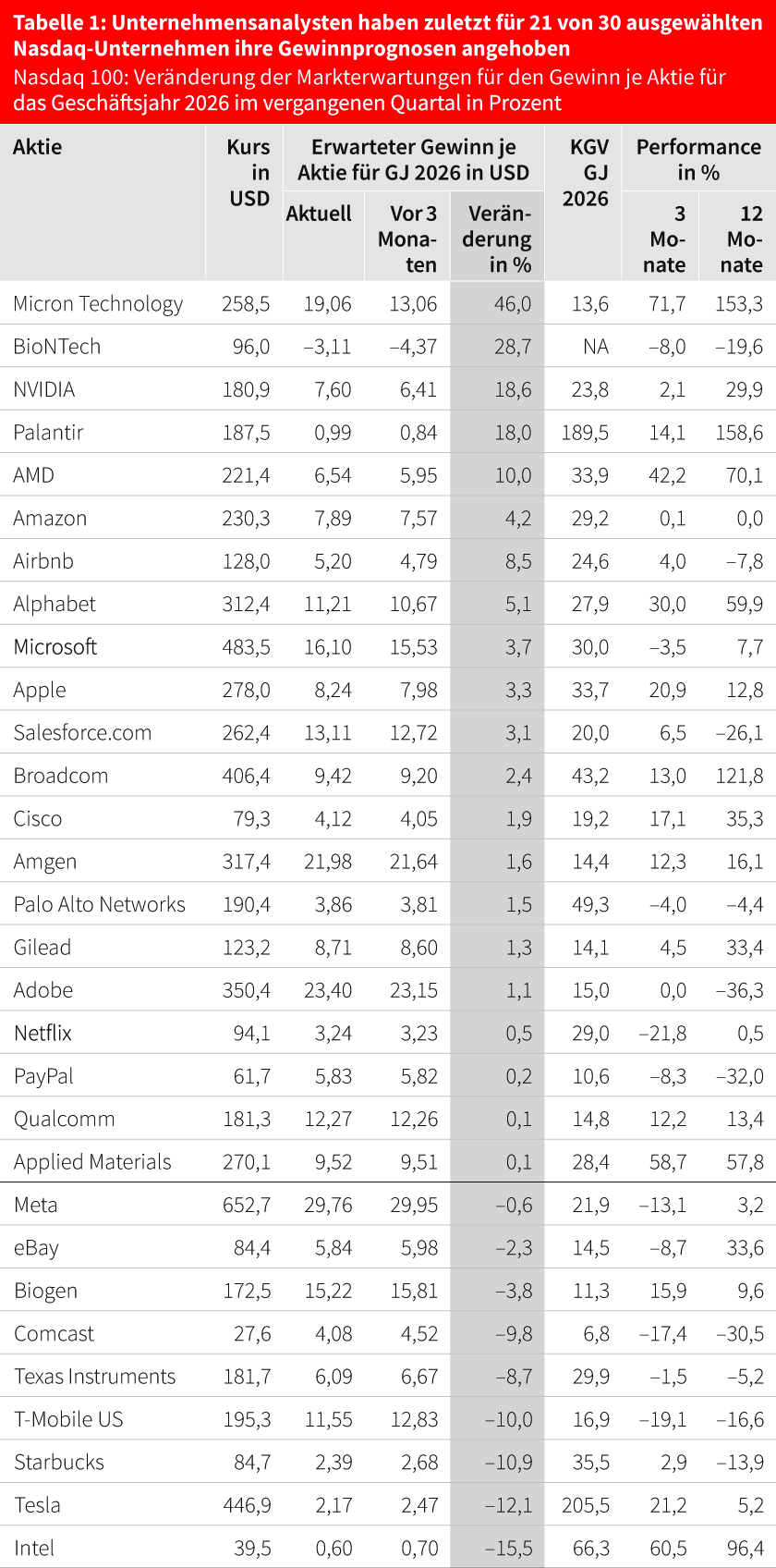 Tabelle 1: Unternehmensanalysten haben zuletzt für 21 von 30 ausgewählten Nasdaq-Unternehmen ihre Gewinnprognosen angehoben