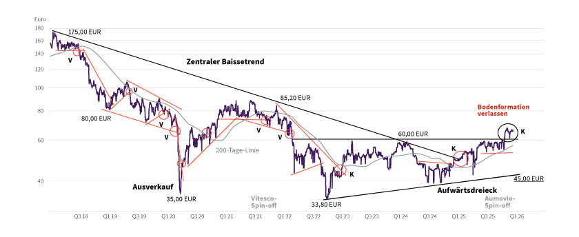 Conti war ausgehend von Kursen um 175,00 Euro (Januar 2018; Kursniveau ist bereinigt um die Abspaltungen) in einer ausgeprägten Baissebewegung unter Druck gekommen. Die beiden Abwärtsbeschleunigungen im Februar/März 2020 (Corona-Gesamtmarktbaisse) bis auf 35,00 Euro und im Oktober 2022 bis auf 33,80 Euro haben diesen Bereich als langfristige Unterstützungszone etabliert. Ab dem Jahr 2022 war der Titel in eine Seitwärtspendelbewegung unterhalb der Widerstandszone um 60,00 Euro hineingelaufen. Sie hat mit der Ausprägung eines mittelfristigen Aufwärtsdreiecks (untere steigende Aufwärtstrendlinie zurzeit bei 45,00 Euro) den charttechnischen Charakter einer Bodenformation. Zunächst war Continental zum Jahresende 2024 bei Kursen um 50,00 Euro mit einem Investmentkaufsignal aus dem zentralen Baissetrend herausgelaufen. Zuletzt hat der Titel die Bodenformation mit einem weiteren Investmentkaufsignal (Sprung über 60,00 Euro) verlassen und arbeitet jetzt an der Etablierung einer Aufwärtsbewegung. Hierbei sollte das nächste mittelfristige Etappenziel im Test der Widerstandszone liegen (76,00 bis 85,00 Euro; stammt aus 2021). Da eine Position in Continental aufgrund der zurzeit herausfordernden Lage der Automobilindustrie sicherlich einen etwas spekulativen Charakter aufweist, sollte ein Sicherungsstopp bei 54,00 Euro (leicht unterhalb der steigenden 200-Tage-Linie) positioniert werden.