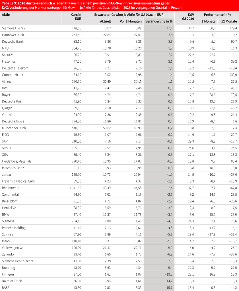 Die Unternehmensgewinne der DAX-Aktien haben sich 2025 enttäuschend entwickelt. Monat für Monat haben die Analysten die Gewinnerwartungen nach unten revidiert, und das Gewinnrevisionsmomentum für die 40 DAX-Unternehmen war fast durchgängig negativ. So gab es Mitte 2025 30 DAX-Unternehmen, für die die Analysten ihre Gewinnerwartungen reduzierten. Dem standen damals nur zehn DAX-Aktien mit positiven Gewinnrevisionen gegenüber. Vor allem der starke Euro und die schwache deutsche Konjunktur, aber auch die hohe Unsicherheit aufgrund des Handelsstreits mit den USA trübten 2025 die Gewinnaussichten am deutschen Aktienmarkt. Doch 2026 dürfte sich das Konjunkturumfeld für die DAX-Unternehmen deutlich verbessern: Die Euro-Aufwertung dürfte an Fahrt verlieren, die deutsche Konjunktur wächst wohl endlich wieder, und die politische Unsicherheit dürfte abnehmen. Daher erwarten wir, dass es 2026 endlich auch wieder Phasen mit einem positiven Gewinnrevisionsmomentum am deutschen Aktienmarkt geben wird. Schon für die vergangenen drei Monate zeigt sich eine deutliche Verbesserung: Die Unternehmensanalysten haben im vergangenen Quartal bereits für 17 DAX-Unternehmen ihre Prognose für den Gewinn je Aktie im Geschäftsjahr 2026 nach oben angepasst, während 23 DAX-Unternehmen fallende Gewinnprognosen hatten (siehe Tabelle 3).