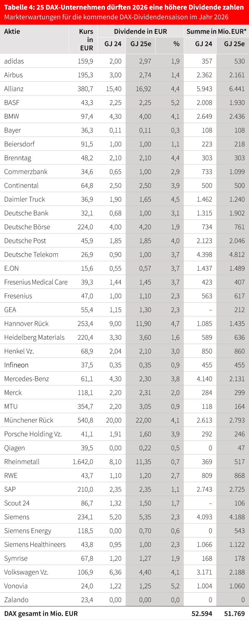 Einige DAX-Unternehmen dürften 2026 dank einer steigenden Dividende je Aktie deutlich mehr an ihre Aktionäre ausschütten. So dürfte die Deutsche Bank ihre Ausschüttung um ungefähr 600 Millionen Euro auf 1.900 Millionen Euro erhöhen. Für die Allianz zeichnet sich eine um 500 Millionen Euro auf 6.450 Millionen Euro steigende Ausschüttung ab. Und auch die Deutsche Telekom dürfte ihre Ausschüttung kräftig um 400 Millionen Euro auf 4.800 Millionen Euro anheben. Zudem wird Siemens Energy wohl 550 Millionen Euro ausschütten, nachdem das Unternehmen drei Jahre in Folge keine Dividende gezahlt hat.