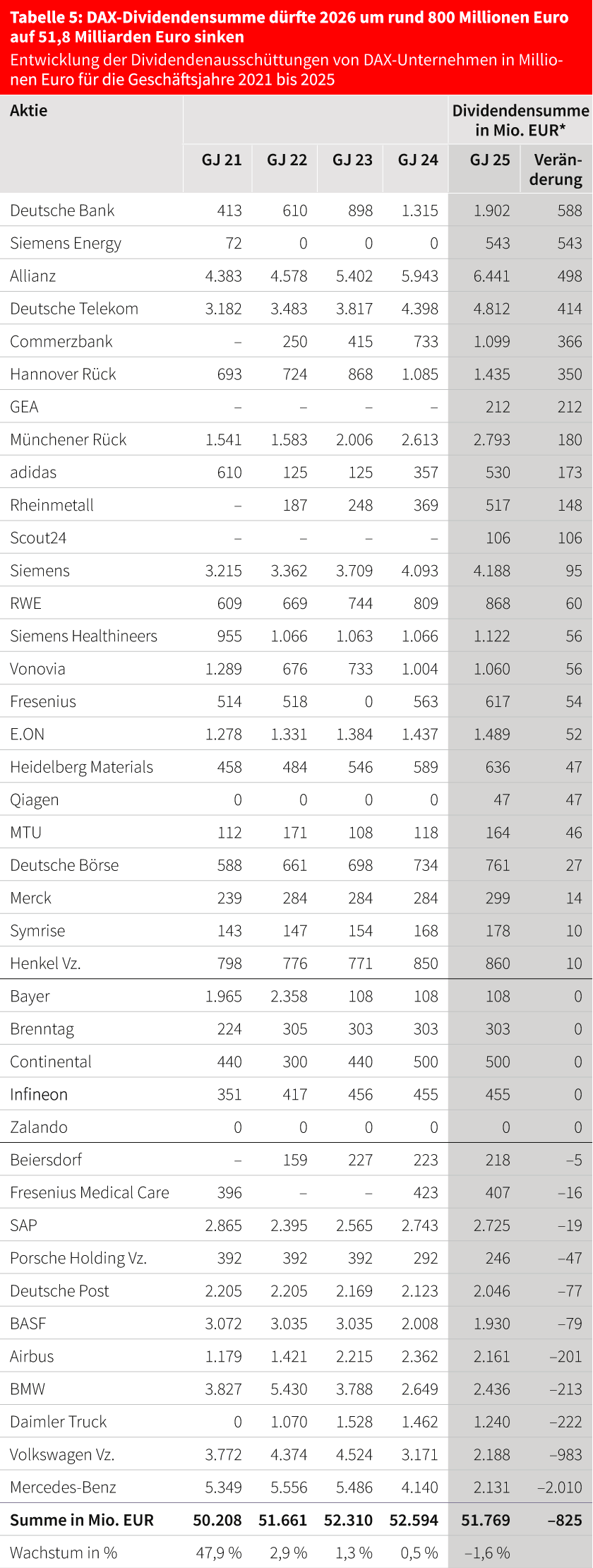 Trend 8: Die DAX-Dividendensumme dürfte 2026 um 1,6 Prozent auf 51,8 Milliarden Euro sinken