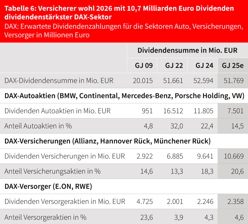 Für den DAX-Versicherungssektor erwarten die Analysten dagegen ein Wachstum der Dividendenausschüttung um 11 Prozent auf rund 10.700 Millionen Euro. Der Anteil der »Versicherer-Dividenden« im DAX dürfte damit von 18,3 auf 20,6 Prozent steigen. Damit steht 2026 am deutschen Aktienmarkt wohl ein Gezeitenwechsel bevor. Im Geschäftsjahr 2011 hatte der DAX-Autosektor den DAX-Versorgersektor, dessen Gewinne und Dividenden damals infolge der Energiewende in Deutschland unter Druck gerieten, als dividendenstärksten Sektor abgelöst. Und 14 Jahre später überholt nun wahrscheinlich der Versicherungssektor den Autosektor, dessen Gewinne und Dividenden unter anderem durch den verschärften Wettbewerb mit chinesischen Herstellern im Markt für Elektroautos unter Druck geraten sind (siehe Tabelle 6).