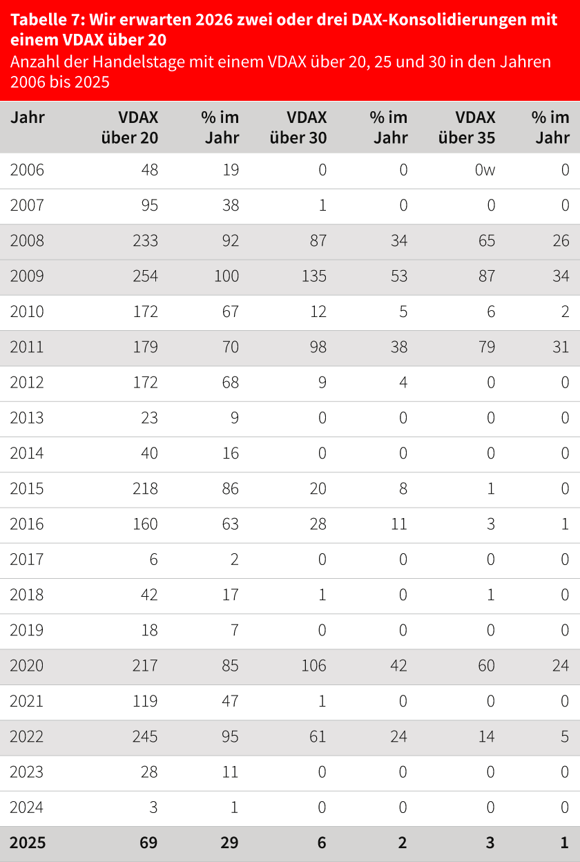 Trend 10: Es dürfte auch 2026 zwei oder drei DAX-Konsolidierungen geben, in denen der VDAX deutlich über die Marke von 20 klettert