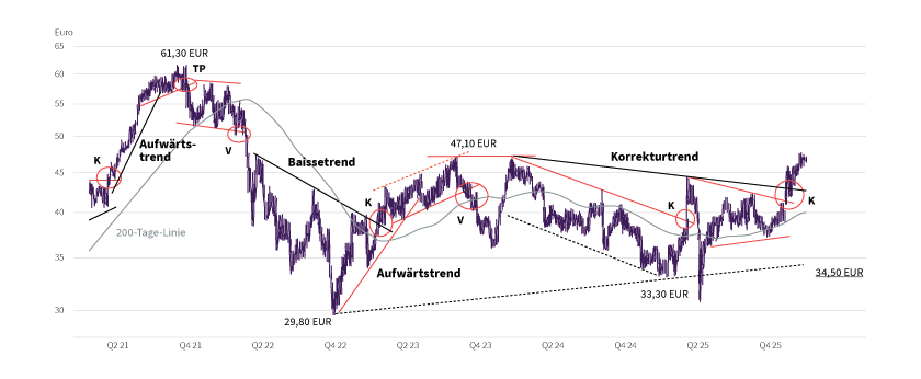 Aus langfristiger technischer Sicht sind die Aktien der DHL Group – trotz der Konjunkturanbindung des Unternehmens – ein defensiver Wachstumswert mit der zusätzlichen Aussicht auf eine attraktive Brutto-Dividendenrendite. Aus übergeordneter Betrachtungsweise besteht die Kursentwicklung der Aktie seit 2000 nur aus zwei Phasen: Zuerst kam es nach dem Börsengang zu einer mehrjährigen Seitwärtspendelbewegung, die aus »normalen« Hausse- und Baissebewegungen und -trends bestand. Ausgehend vom Baissetief um 7,20 Euro im Jahr 2009 (Kurstief während der Finanzkrise 2008/2009) befindet sich der Titel in einer moderaten Haussebewegung. Sie wird durch eine fast 17-jährige Haussetrendlinie begrenzt, die im März 2009 startete und am Coronabaissetief (März 2020 bei 19,10 Euro) ansetzt. Dieser Trend liegt derzeit bei ungefähr 33,00 Euro. Innerhalb dieser übergeordneten Haussebewegung hat der Wert im August 2021 bei 61,30 Euro (Widerstandszone) seine bisherigen Allzeithochs etabliert. Während der Gesamtmarktbaisse 2022 wurde auch die DHL-Group bis auf 29,80 Euro gedrückt. Seitdem befindet sich der Titel wieder in einer moderaten Aufwärtsbewegung, wobei allerdings in den Jahren 2023 bis 2025 sowohl gegenüber dem DAX als auch gegenüber dem EURO STOXX 50 eine ausgeprägte Relative Schwäche vorlag. Zuletzt verbesserte sich allerdings die technische Lage grundlegend. Die Abwärtskorrektur, die zum Jahreswechsel 2023/2024 bei 47,10 Euro startete und zuletzt im Umfeld der leicht steigenden 200-Tage-Linie (zurzeit bei 40,20 Euro) in eine kurzfristige Dreiecksformation hineingelaufen war, ist mit einem Investmentkaufsignal verlassen worden. Die Aktie arbeitet damit an der Etablierung einer neuen mittelfristigen Hausse, wobei zuletzt auch die kleine Widerstandszone um 47,10 Euro überwunden wurde. Aus langfristiger technischer Sicht setzt sich damit die seit fast 17 Jahren bestehende Haussebewegung fort. Damit sollte es nicht überraschen, wenn es bei der DHL Group, bei der auch 2026 eine Dividendenzahlung von 1,85 Euro (Hauptversammlung am 5. Mai 2026) und damit eine geschätzte Brutto-Jahresdividendenrendite von 3,85 Prozent erwartet wird, zu einem Test der Widerstandszone um 61,30 Euro an das bisherige Allzeithoch kommt.