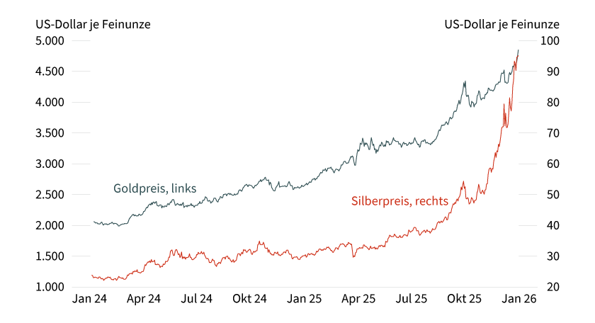 Der Goldpreis startete in das neue Jahr mit einem Anstieg auf ein neues Rekordniveau von mehr als 4.800 US-Dollar je Feinunze, ebenso der Silberpreis, der auf fast 96 US-Dollar je Feinunze stieg (siehe Grafik 1). Rückenwind geben geopolitische Ereignisse wie die Massenproteste im Iran und die gewaltsame Reaktion des Mullah-Regimes darauf, was ein (militärisches) Eingreifen der US-Regierung aus Sicht der Marktteilnehmer zwischenzeitlich wahrscheinlicher machte (siehe auch weiter unten). Zuvor hatten bereits die spektakuläre Absetzung und die Entführung von Venezuelas Machthaber Maduro im Rahmen einer US-Militäroperation und die von US-Präsident Donald Trump offen artikulierten Annexionspläne gegenüber Grönland für Aufsehen gesorgt. Sie eskalierten zuletzt mit der Androhung von Strafzöllen gegen acht europäische NATO-Mitgliedsländer. Zudem spitzt sich in den USA der Streit zwischen der Regierung und der Fed zu, nachdem das US-Justizministerium juristisch gegen Fed-Chef Jerome Powell vorgehen will. Vordergründig geht es um die angeblich zu hohen Renovierungskosten des Fed-Gebäudes. Tatsächlich dürfte die Regierung aber Einfluss auf die Geldpolitik der US-Notenbank nehmen wollen. Konkret verlangt US-Präsident Trump schon seit längerer Zeit deutlich stärkere Zinssenkungen, als die Fed bislang umzusetzen bereit ist.