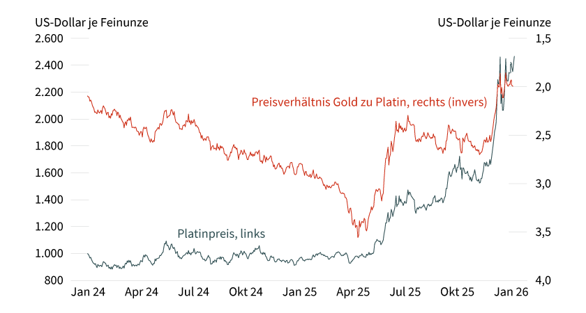 Der Platinpreis legte im Schlepptau von Gold und Silber ebenfalls kräftig zu und erreichte mit mehr als 2.500 US-Dollar je Feinunze auch ein neues Rekordniveau. Platin stieg im vergangenen Jahr deutlich stärker als Gold. Das Gold-Platin-Verhältnis liegt deshalb inzwischen bei knapp unter 2, was zuletzt im Juni 2023 der Fall war. Im April 2025 war es auf 3,5 gestiegen (siehe Grafik 3). Der Platinpreis hat somit seine Unterbewertung gegenüber dem Goldpreis in den vergangenen acht Monaten deutlich reduziert. Ein weiteres Aufholen gegenüber Gold dürfte von nun an schwieriger werden, da Platin im Gegensatz zu Gold kein sicherer Hafen, sondern hauptsächlich von der Industrienachfrage und damit von der Konjunkturentwicklung abhängig ist. Zudem dürfte der Platinmarkt in diesem Jahr gemäß Prognose des World Platinum Investment Council nicht mehr unterversorgt sein. Wir sehen nach dem kräftigen Preisanstieg für Platin im vergangenen Jahr nur noch begrenztes Aufwärtspotenzial. Der Platinpreis dürfte zur Jahresmitte bei 2.600 US-Dollar und zum Jahresende bei 2.700 US-Dollar notieren.