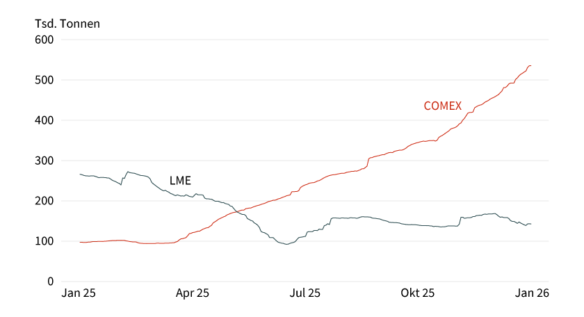 Die Industriemetalle sind bislang ebenfalls stark ins neue Jahr gestartet. Der Kupferpreis erreichte mit 13.400 US-Dollar je Tonne ein Rekordniveau. Bei Kupfer spielen neben den mittlerweile bekannten Sorgen rund um einen Rohmaterialmangel neue Ängste hinsichtlich der Einführung von US-Zöllen eine Rolle für den jüngsten Preisschub. Zu erkennen ist das an den weiterhin steigenden Lagerbeständen an der COMEX. An der LME fallen die Bestände nach einer zwischenzeitlichen Erholung nach Einführung der US-Zölle dagegen wieder (siehe Grafik 4). Denn die Zölle werden zunächst nur auf halbfertige Kupferprodukte und Derivate fällig. Es wird nun aber offenbar befürchtet, dass die Zölle doch noch auf Kupferraffinade ausgeweitet werden, weshalb US-Unternehmen ihre Kupferlager wieder bzw. weiter ausbauen. Da es allerdings bislang keinerlei Indikation gibt, ob und wann tatsächlich ein solcher Schritt kommt, erscheint eine Fortsetzung dieses Lageraufbaus fraglich.
