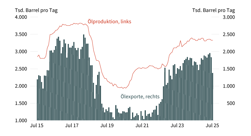 Grafik 5: Ölproduktion und Ölexporte des Iran bis zuletzt auf hohem Niveau